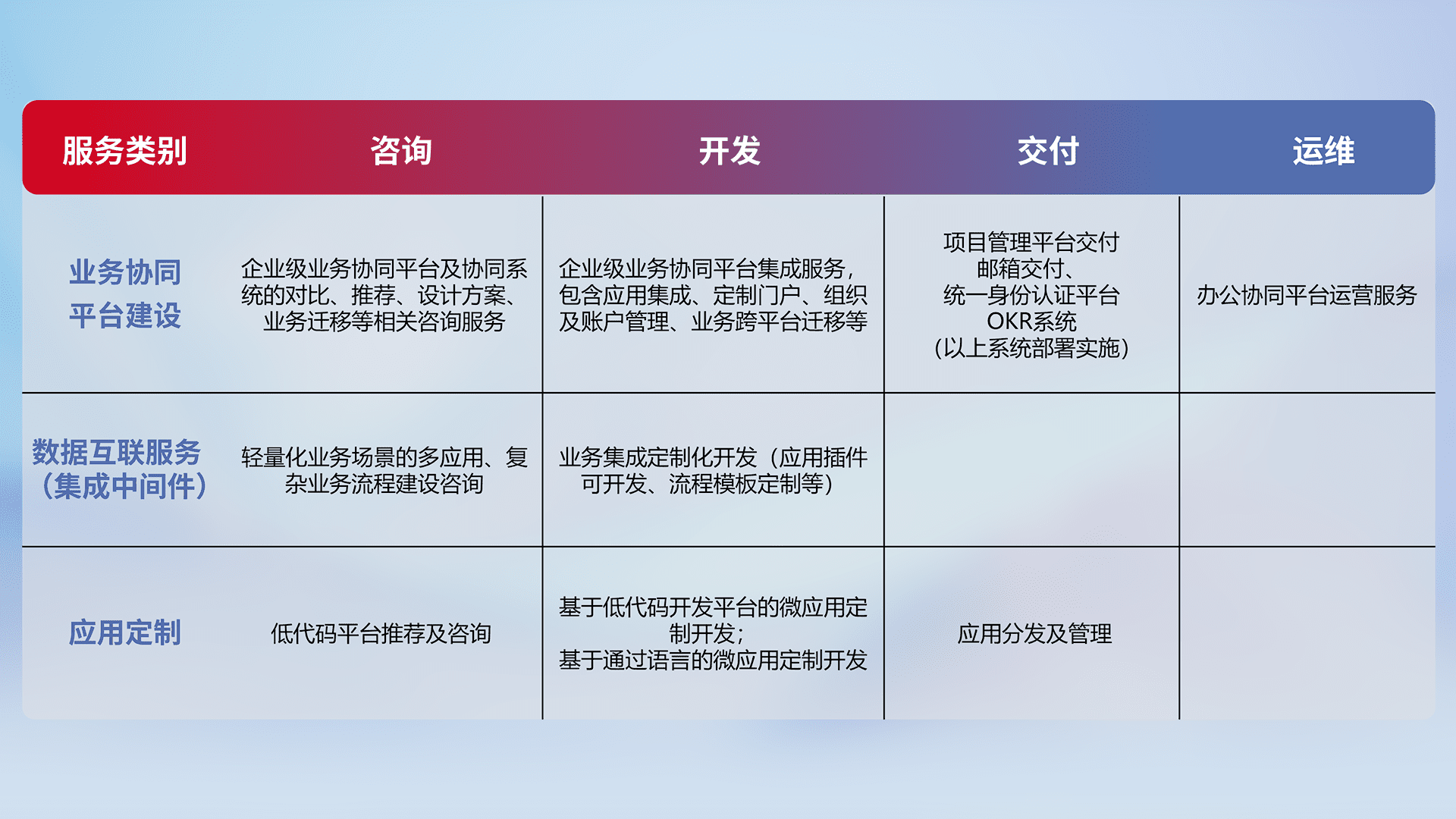 针对钉钉、、、企微、、IDaas等平台级产品提供产品的规划、、、、方案、、交付、、定制化开发等服务,,,实现如统一协同办公、、、智能客户服务、、、、混合会议管理、、智能数据查询、、、、等业务场景,,实现数字化转型。。。。